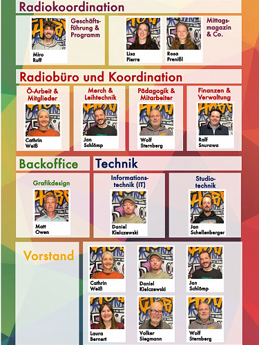 - Es gibt ein ansprechendes, modernes Organigramm auf der StHörfunk-Homepage sowie ausgedruckt im StHörfunk-Foyer und in unserem Schaukasten