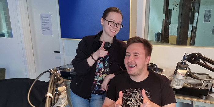 Daumen hoch für einen einen besonderen Wert: Die spontanen Gäste Alina & Markus bei der Radiospielwiese im April 2025 im Gläsernen Studio.